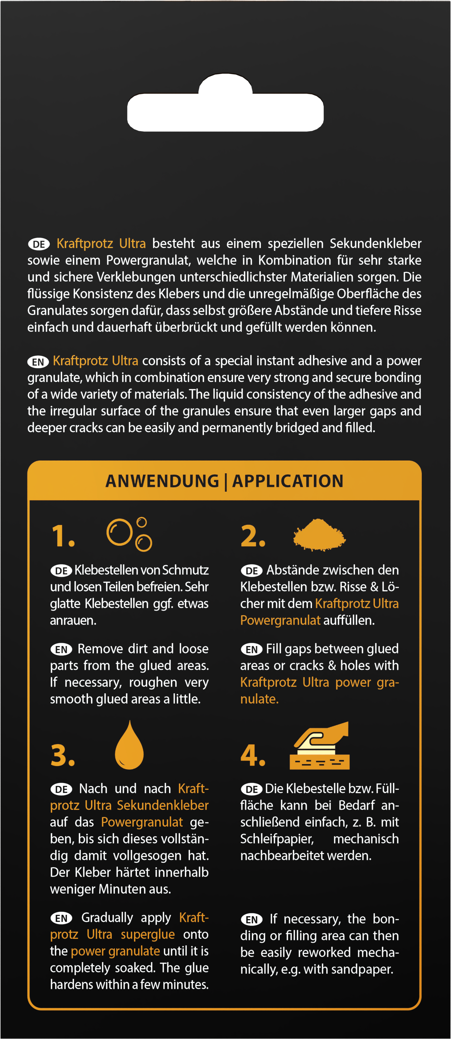 Nach dem Aushärten entsteht eine harte, hochbelastbare Verbindung, die sich schleifen, formen und weiterbearbeiten lässt. Dadurch ist Kraftprotz Ultra ideal für Reparaturen, Verstärkungen, Modellbau und die Nachbearbeitung von 3D-Druck-Teilen, überall dort, wo herkömmliche Sekundenkleber an ihre Grenzen stossen.